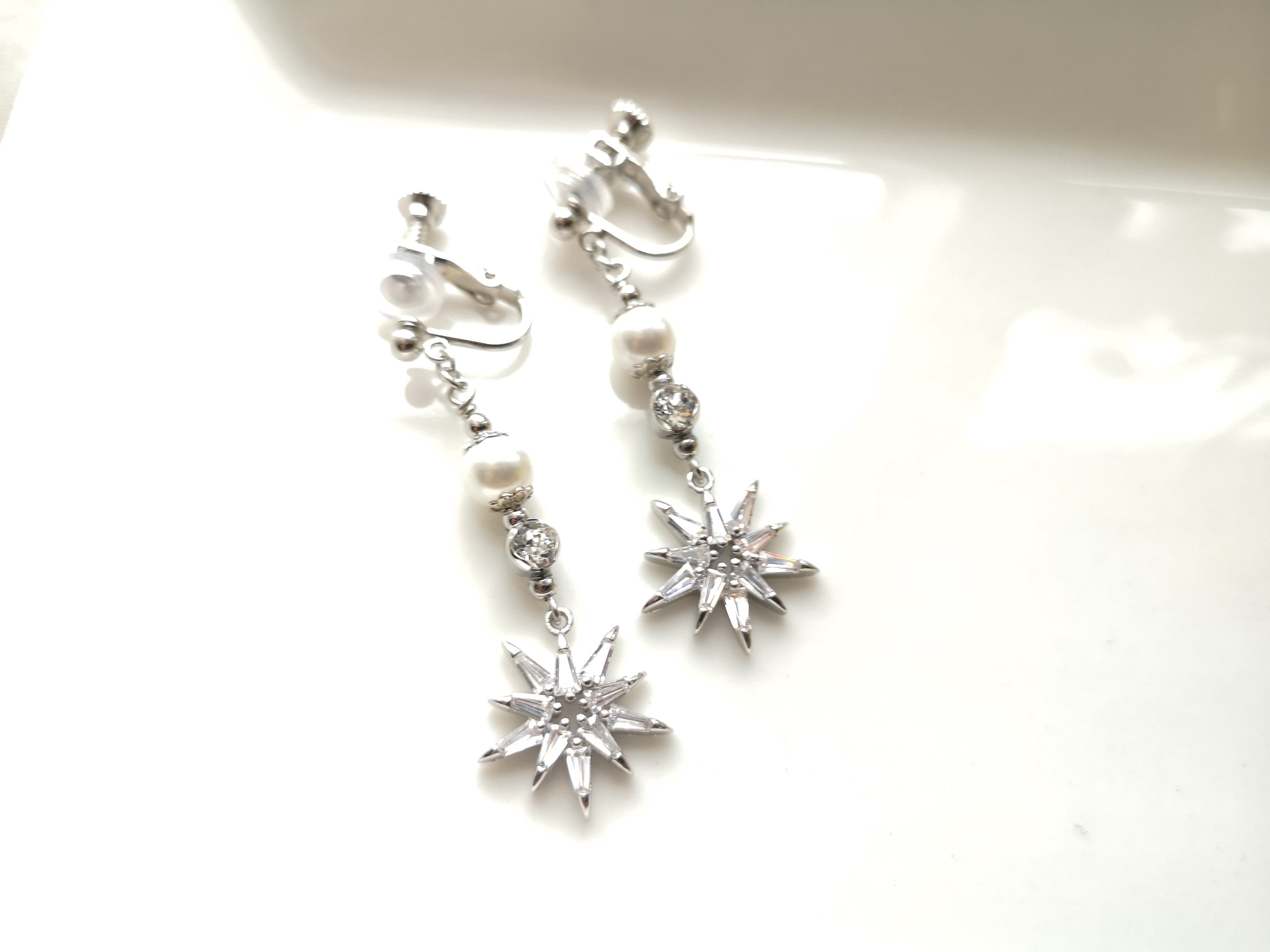 貝パール/プレゼント/スワロフスキー/クリスタル/キュービックジルコニア/ギフト/お祝い/花/シルバー/シシィスター/星/スター/イヤリング/